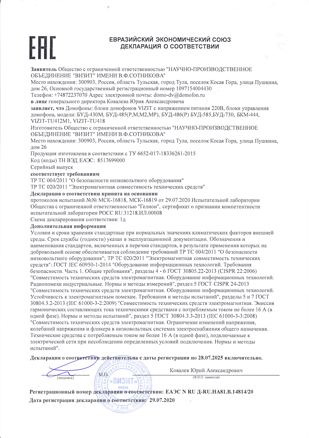 Блок управления домофона БУД-302S-80 работает в комплекте с многоабонентскими блоками вызова (БВД) серии 300 как составная часть многоквартирных домофонов, видеодомофонов VIZIT;