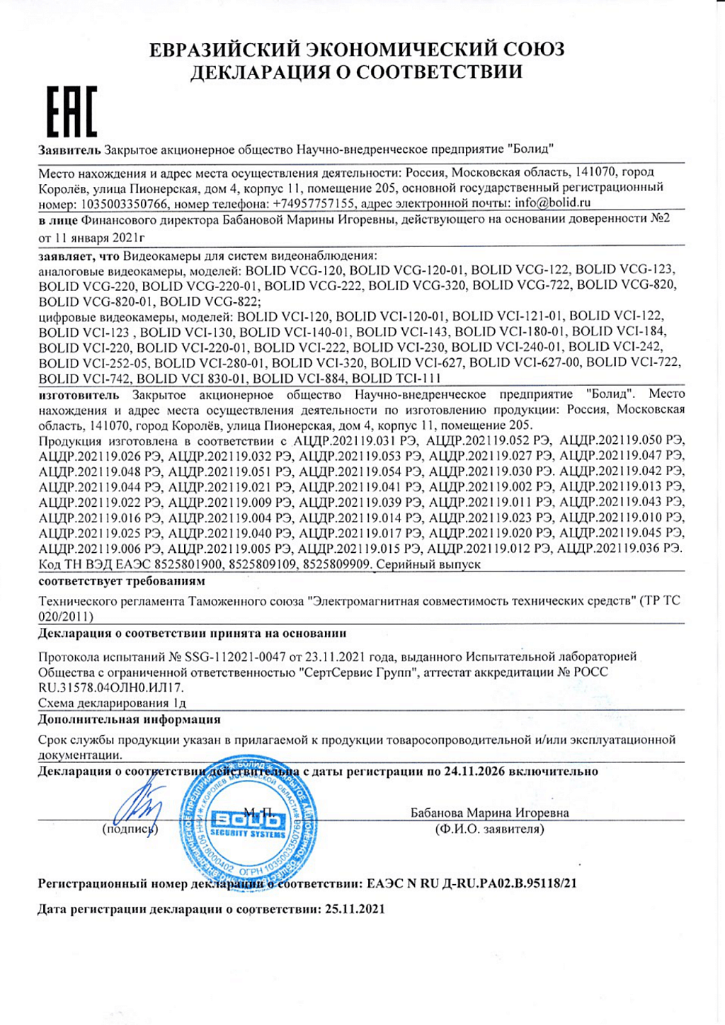 Декларация о соответствии Камера VCI-121-01 Уличная цилиндрическая, 2 Мп вер. 2 BOLID
