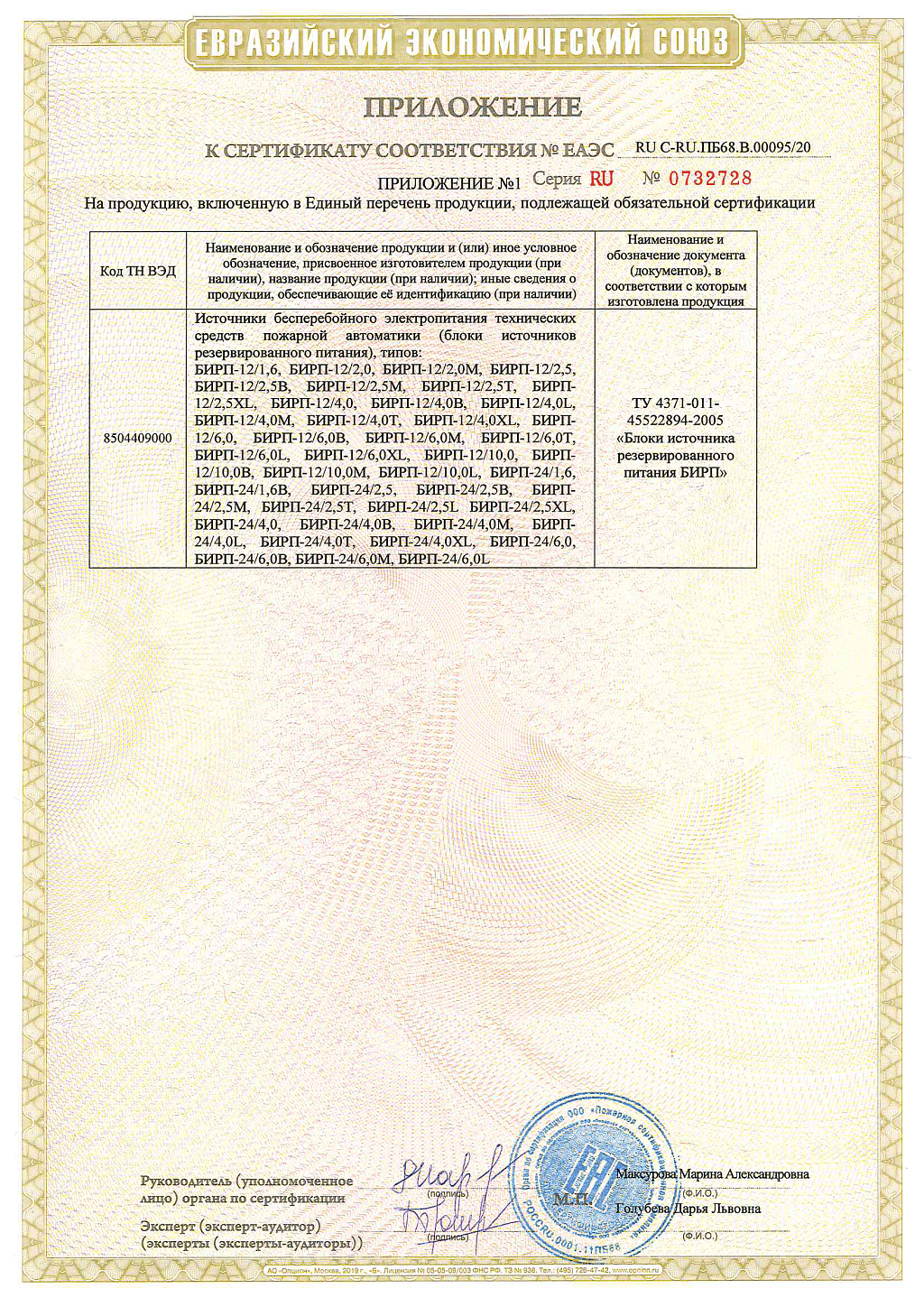Прибор предназначен для гарантированного электроснабжения постоянным током технических средств охраны, сигнализации и связи. В БИРП имеется защита аккумулятора от глубокого разряда. Прибор имеет следующие особенности: обеспечивает автоматическое отключение и заряд АБ, а также защиту от неправильного подключения (переполюсовки) АБ; прибор снабжен электронными защитами от короткого замыкания и превышения выходного напряжения; в блоке предусмотрены информационные выходы «Контроль Сети (КС)», «Контроль батареи (КБ)» и выходы «Контроль выхода (КВ)» для передачи информации во внешние цепи. Блок рассчитан на эксплуатацию в закрытых помещениях