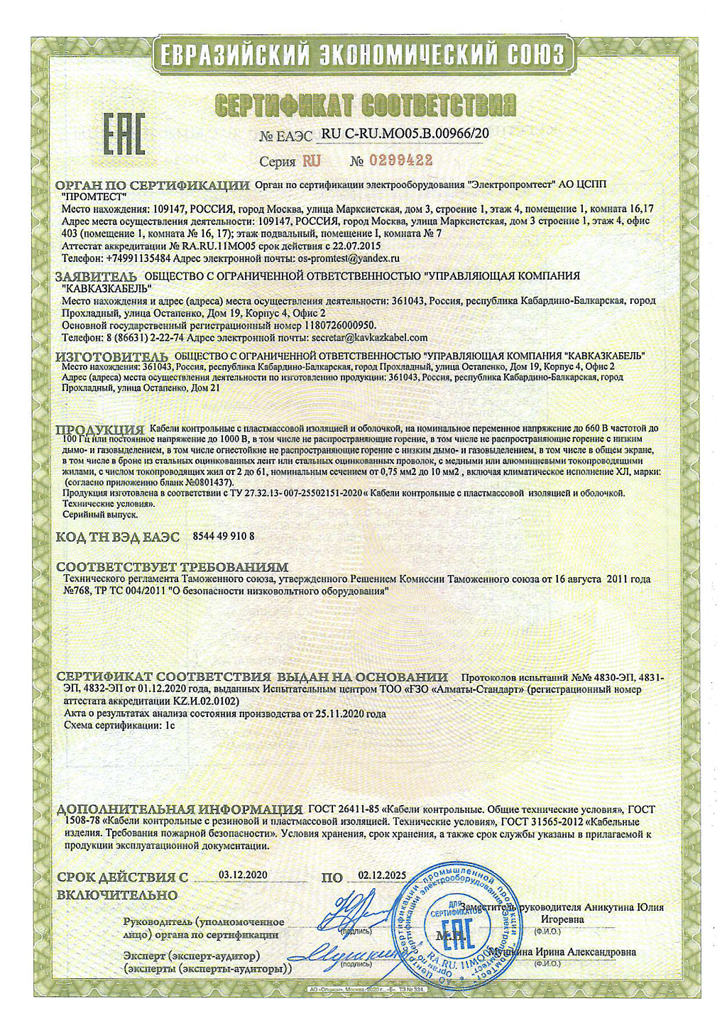 Кабель с медными однопроволочными токопроводящими жилами, с термическим барьером в виде двух слюдосодержащих лент, с изоляцией и оболочками (внутренней и наружной) из ПВХ-композиции пониженной пожароопасности с низким дымогазовыделением. Предназначен для передачи и распределения электроэнергии в стационарных установках.