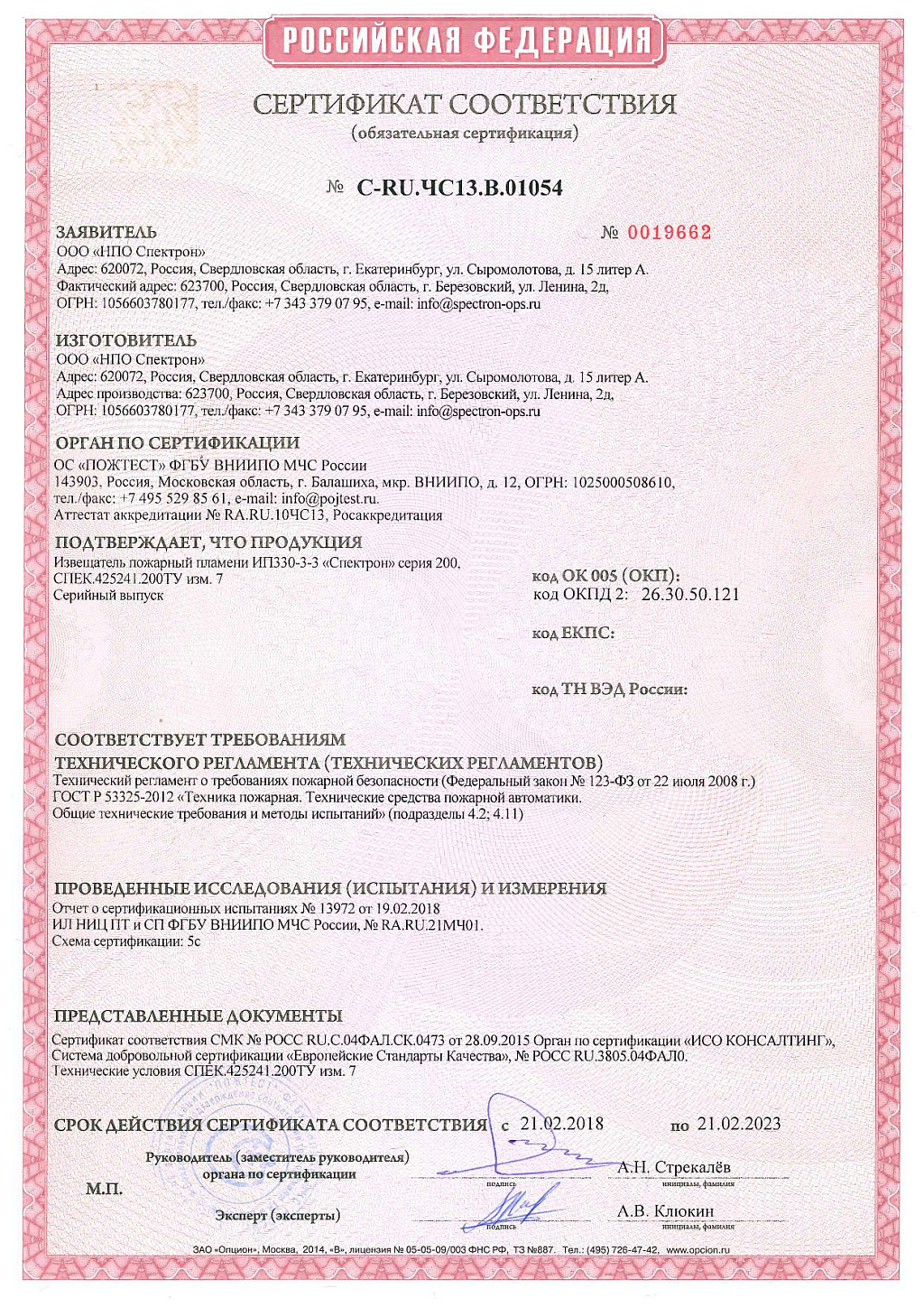 Сертификат соответствия Извещатель С2000-Спектрон-207 BOLID