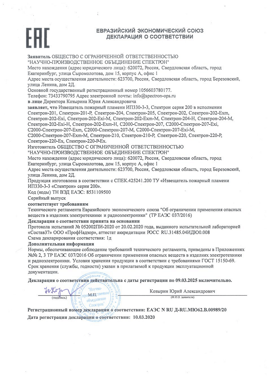 Декларация о соответствии Извещатель С2000-Спектрон-207 BOLID